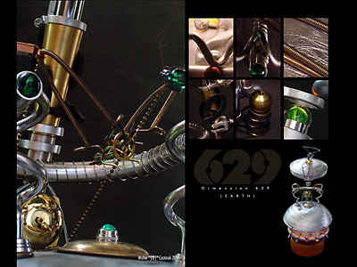 There are only 3 screws and 1 nut holding this piece together. The rest is comprised of springs, collars and such. Above the clock-faced rabbit there is a marble overseer rotating in his spring chariot and then above is a rotating coil representing our universe unravelling. Motorized piece with 3 points of light.